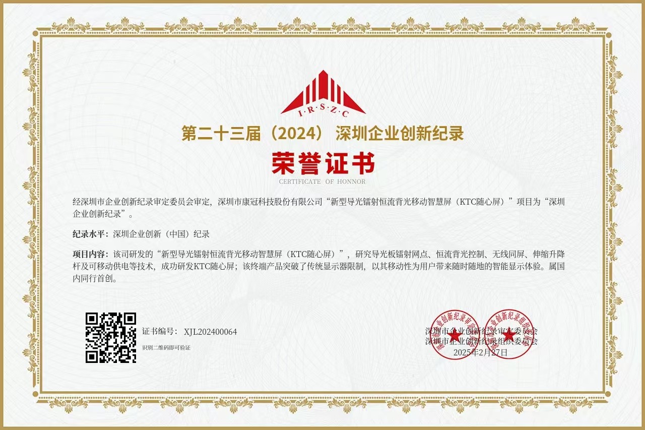 À la suite de cette reconnaissance, KTC Technology s’est vu décerner le titre d’« Entreprise indépendante de référence en matière d’innovation » lors de la cérémonie d’approbation et de publication du « 23e Palmarès de l’innovation des entreprises de Shenzhen ». Le projet « Nouvel écran mobile intelligent à rétroéclairage par laser à guide de lumière et à courant constant » de l’entreprise a reçu le prix « Innovation Record of Shenzhen Corporations » et a atteint le niveau « Innovation (China) Record of Shenzhen Corporations ».