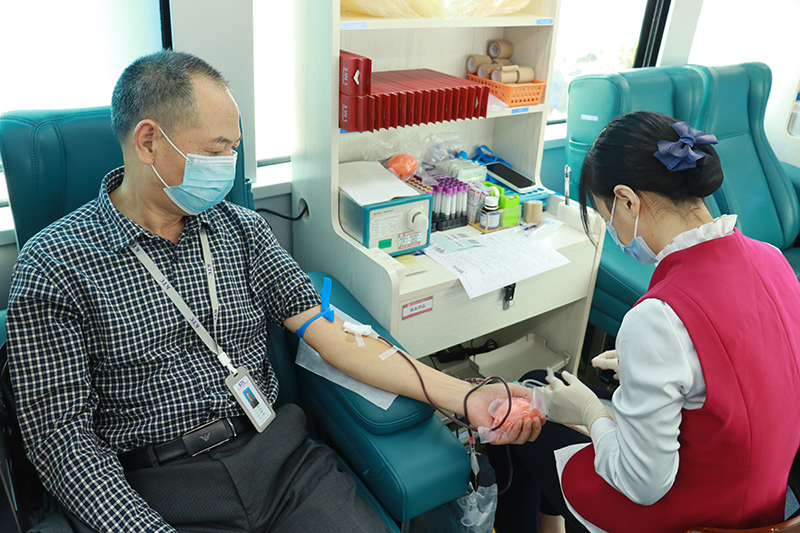 在献血现场,在医务人员的引领下,员工有序进行了信息登记、血压检测、血液检测等环节。