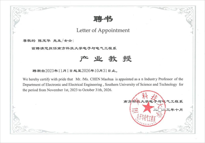 为推动产学研深度融合,加快技术创新与产业升级,培养高素质人才,促进创新创业发展,实现资源共享与互利共赢,推动区域经济发展,华体会体育副总裁凌峰、陈茂华受聘为南方科技大学电子与电气工程系产业教授,聘期为2023年11月1日至2026年10月31日。