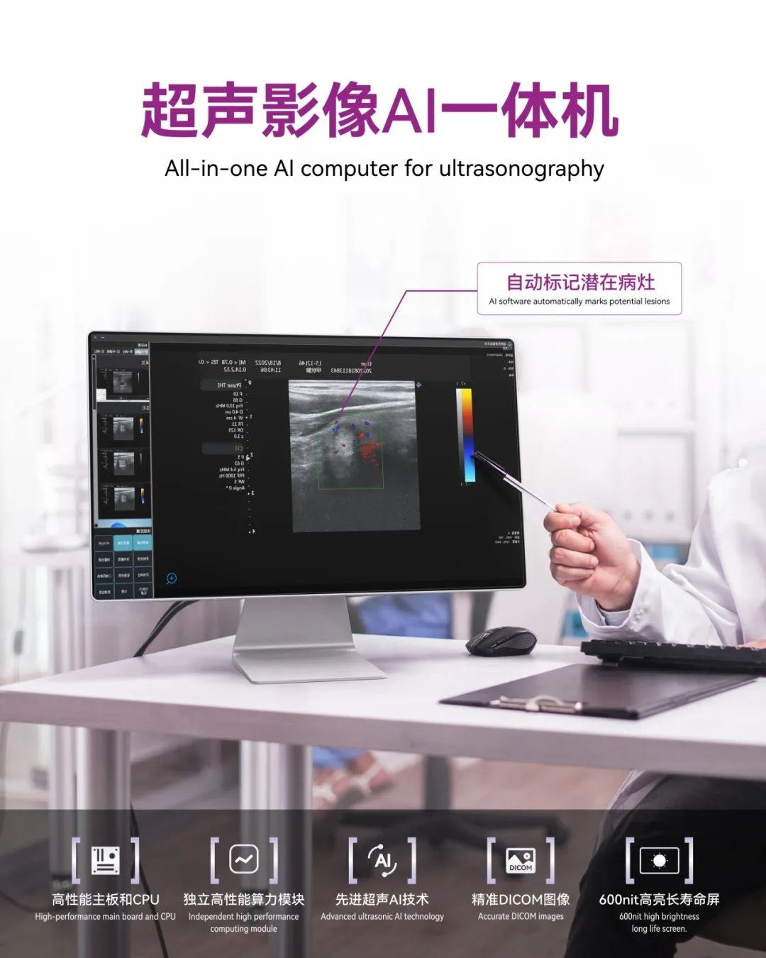同时,AI一体机采用最新的超声AI技术,能够智能识别并分析图像,内置的AI软件可以自动识别异常病灶并给出初步诊断建议,辅助医生快速做出判断,极大提升诊断的准确性。适用于多种医疗应用场景,如腹部、妇产科、心脏、血管等领域,为如医院、诊所等医疗机构提供了一个全方位的超声诊断解决方案。