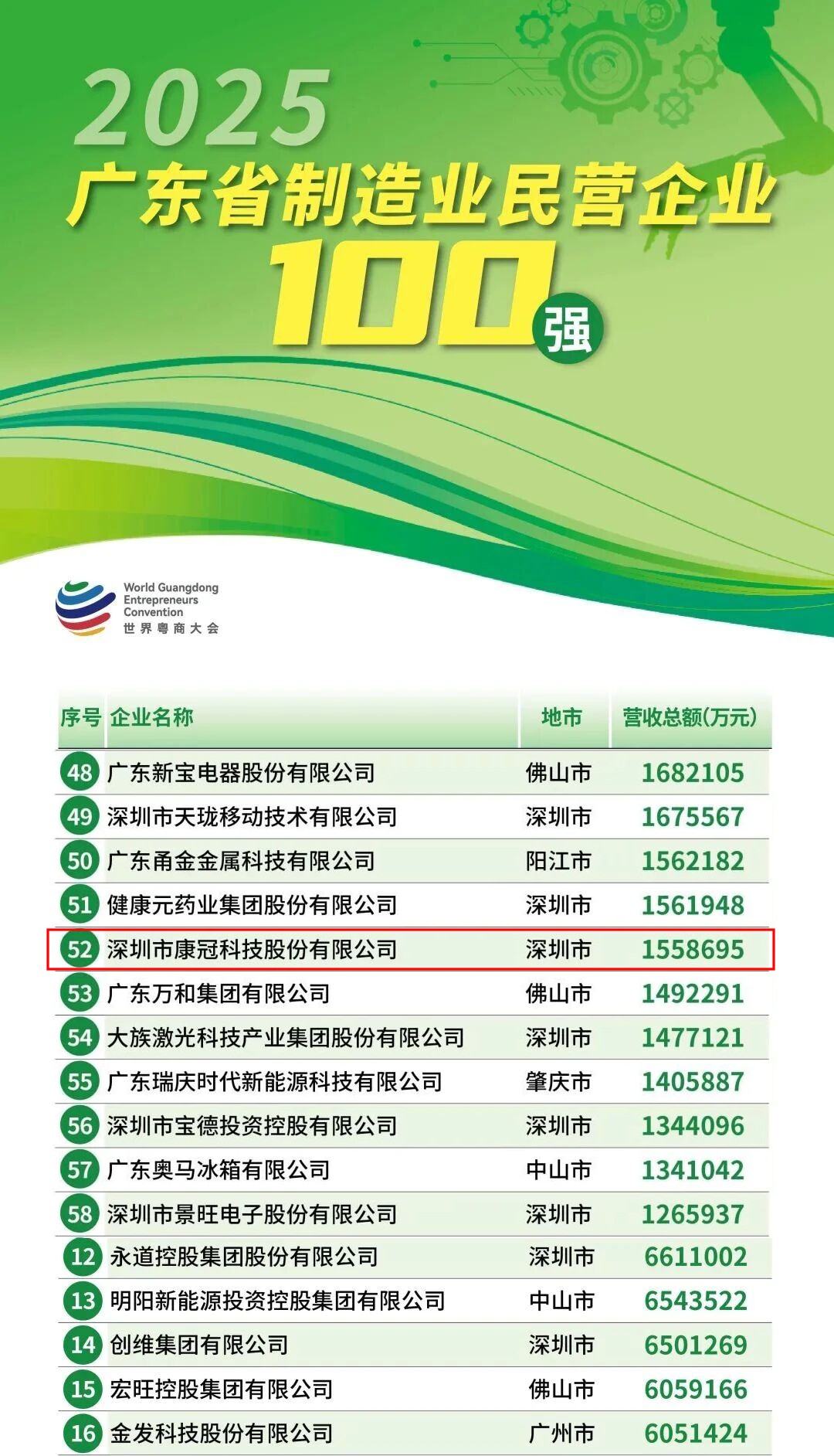 9月29日,广东省工商业联合会正式发布2025年广东省民营企业100强系列榜单。华体会·体育 - 华体会(中国)凭借卓越的综合发展与实力,同时荣登两大重量级榜单:位列“广东省民营企业100强”第87位,“广东省制造业民营企业100强”第52位。